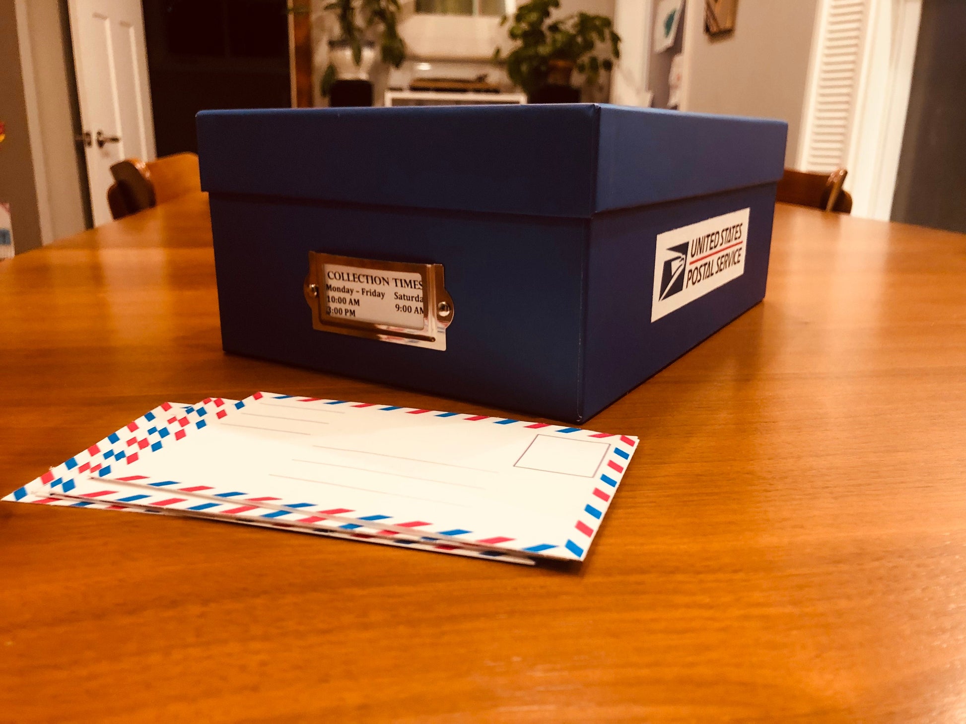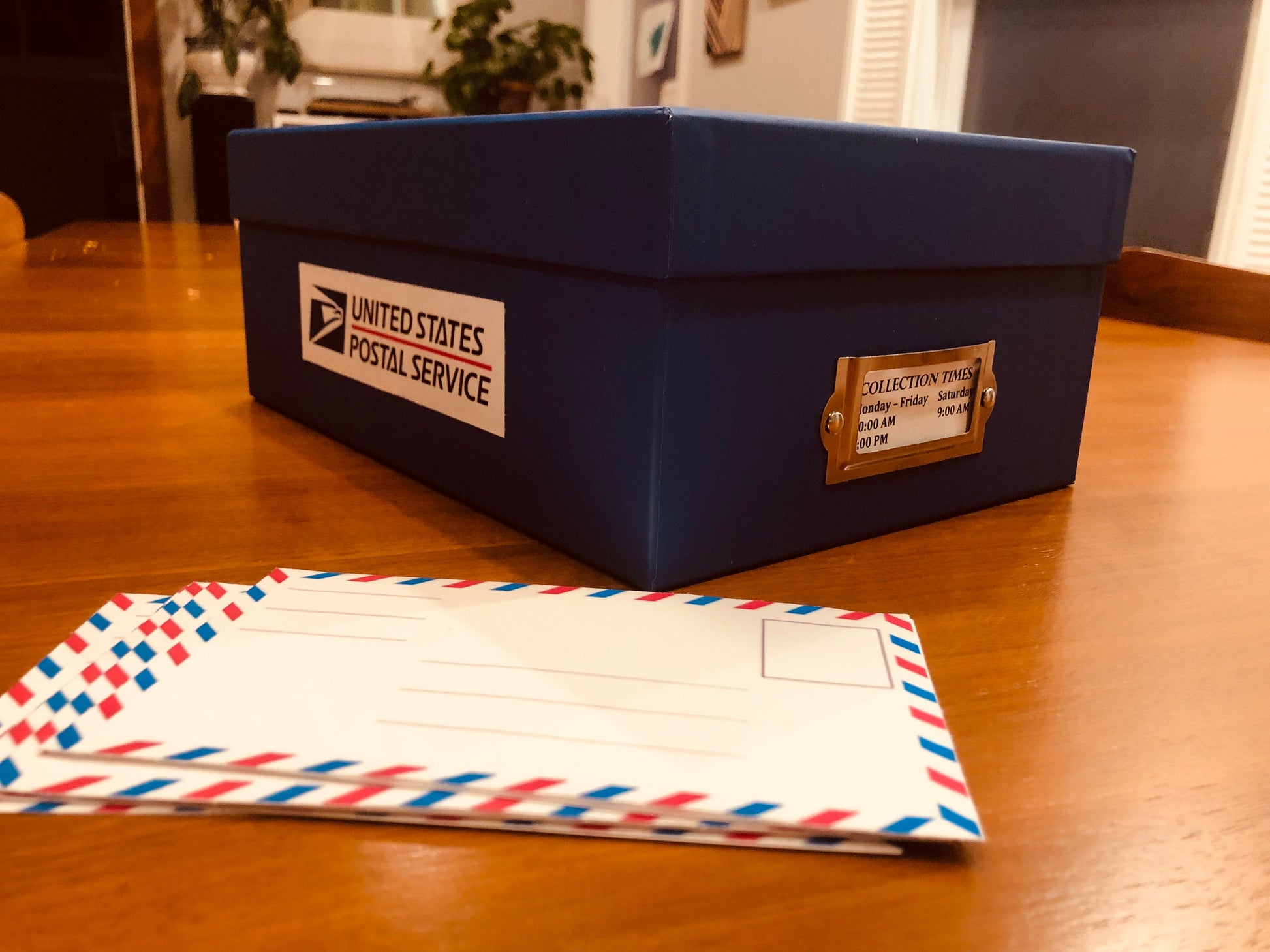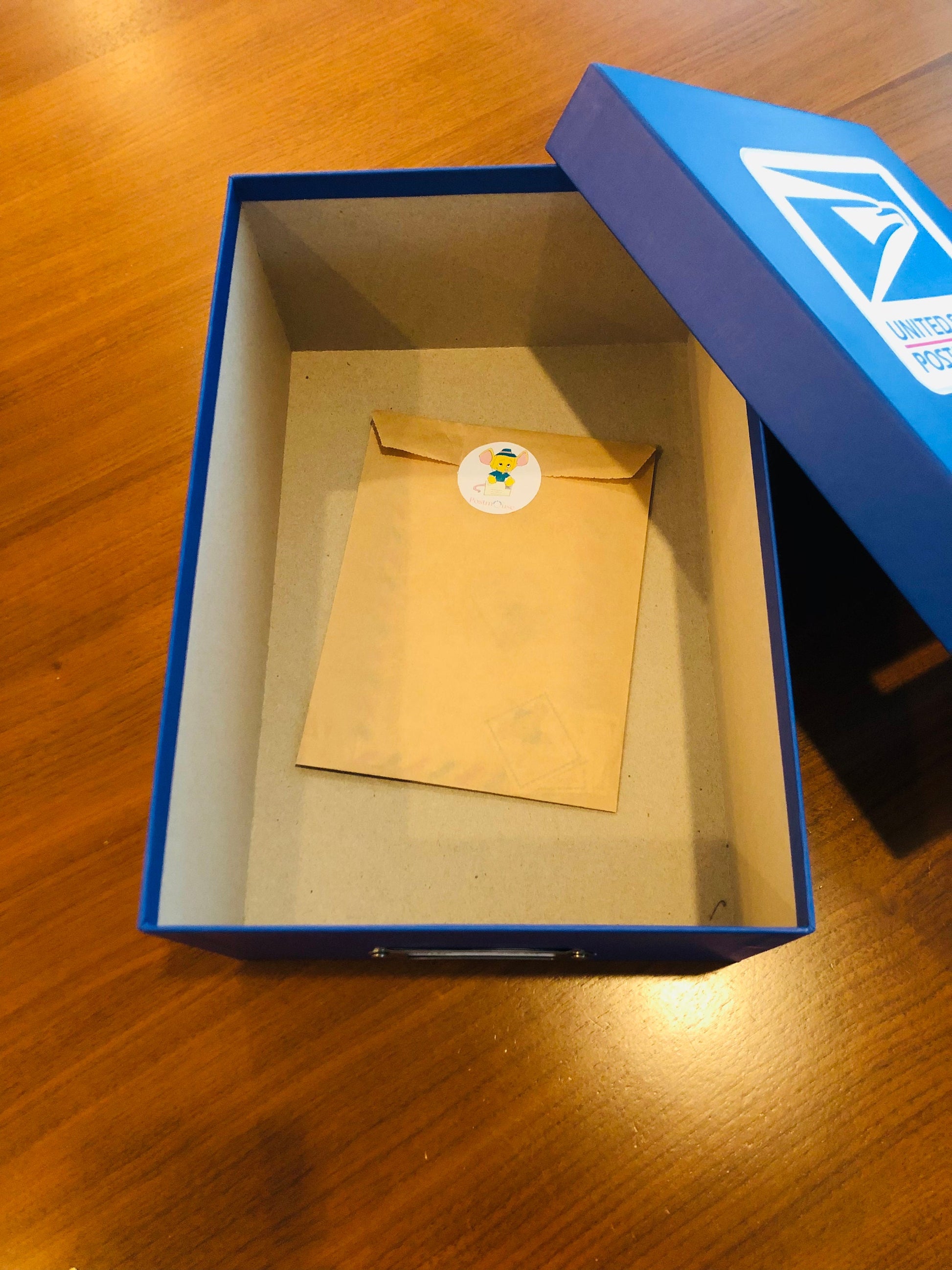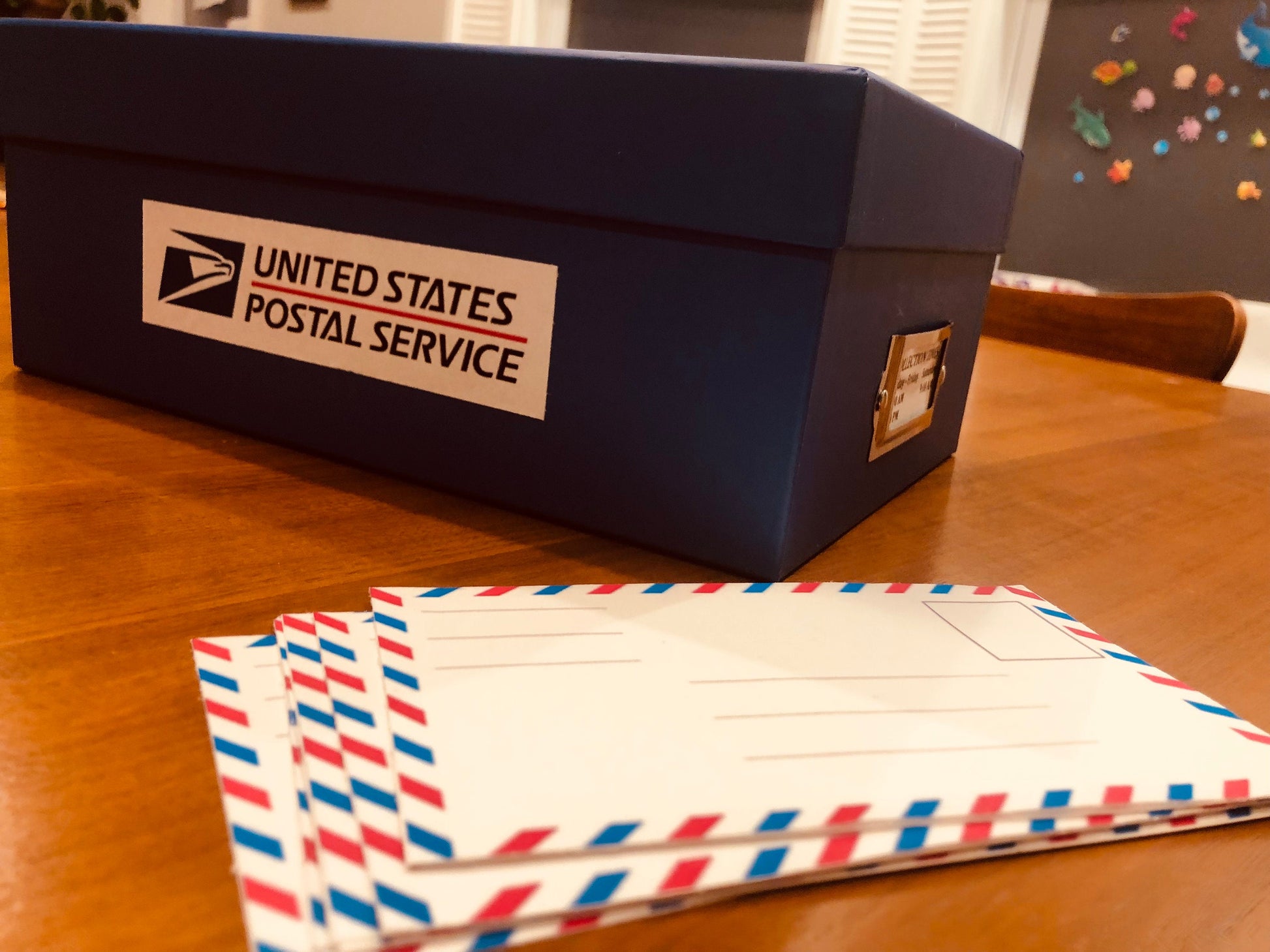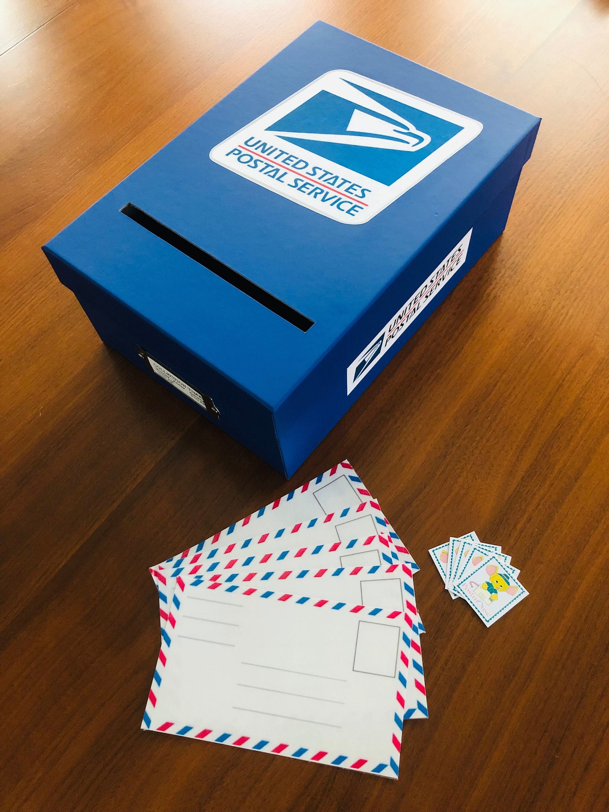 Materials: Cardboard box,laminated envelopes,sticker stamps